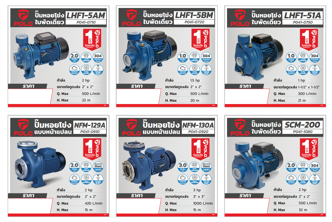 เครื่องสูบน้ำ-ปั๊มน้ำโปโล POLO รุ่น NFM-129A เป็นเครื่องสูบน้ำ-ปั๊มน้ำแบบหน้าแปลน (Frange Water Pumps) ตัวเครื่องผลิตจากเหล็กหล่อ ใบพัด (Impeller) ผลิตจากทองเหลือง เพลาผลิตจากสแตนเลส (Stainless Steel Seal)b กำลัง 2 แรงม้า (Hp)